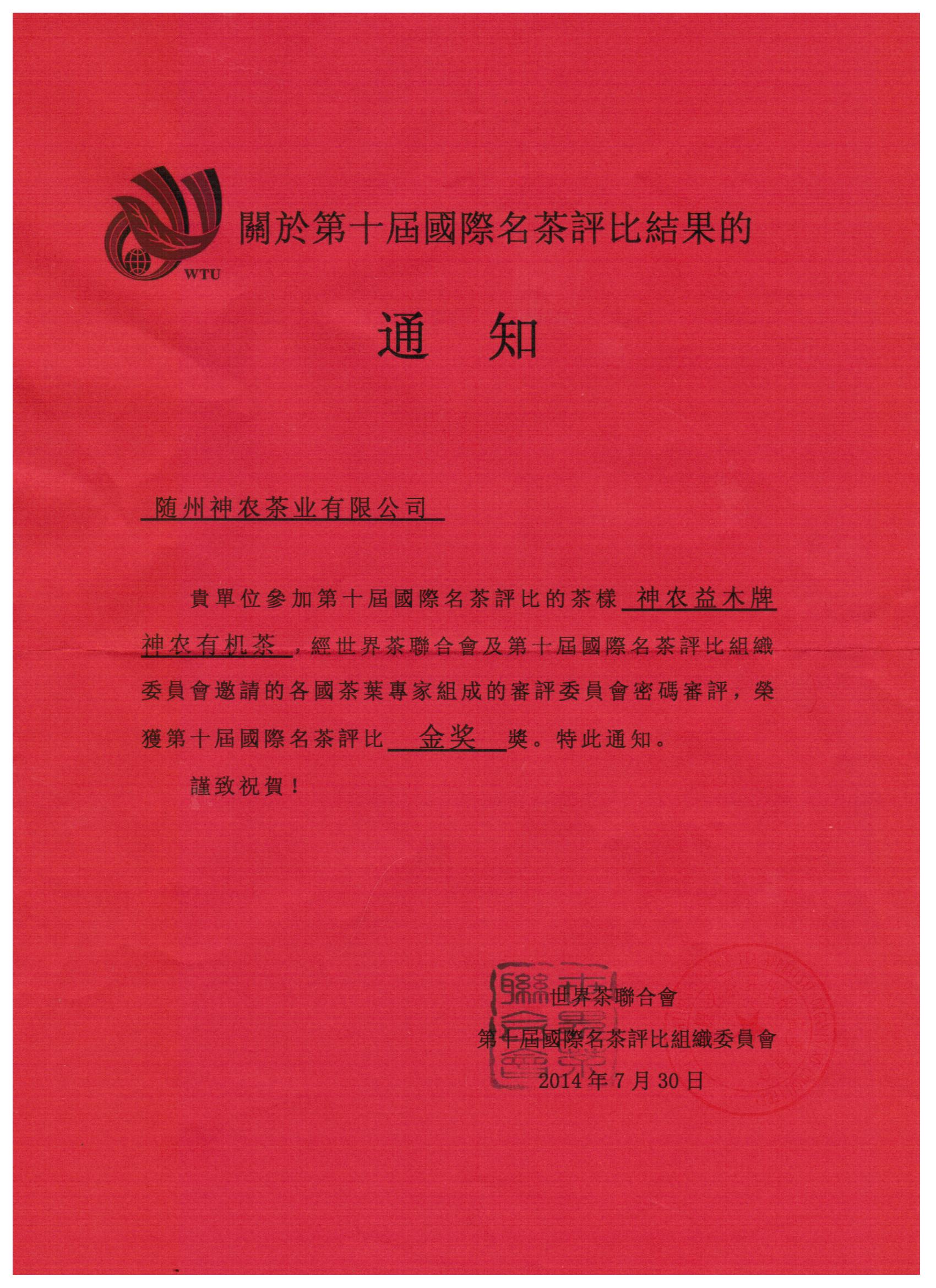 神農(nóng)有機(jī)茶"再次榮獲第十屆國際名茶評比"金獎"